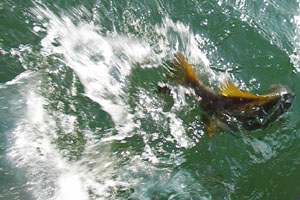 で、釣りの話ですが、最初は普通の釣り。表層ピロピロ。SHIGEROさんのTEMPTのスモール必殺ワームに2発乗ったんですが、オレのチビアダーには出たけど乗らず。3回ほど食ったけど、どーみてもワームが口に入る大きさじゃない「オレの友達サイズ」(20cm以下)。