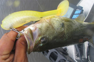 ハンダのフットボールを愛用してるんですが、去年はロングキャストでスイミングメインだったので、長めのミディアムなテキサス系ロッドでやってたんですが、今回はどっちかって言うとボトムトントン・ジグジグが多いんで、5.1ftレギュラーテーパーなMHの専用ロッド(HLZ-511MHRB)でフットボールやってます。このロッドは結構硬いんで、ハンダジグだと掛かりどころによってフックが曲がる事もあり、後半はDEPSのヘッドロックジグも混ぜ気味に。さすがに針は丈夫です。大きいしネムリ気味なのと、ボトムで食わす関係で、クチビルにバッチリ掛かる事が多くて、今年はほとんどミスでしてないです。去年はフォール中のバイトが多くて口の奥の上に掛かったり、ジャンプされまくりでバレまくりでした。今年は絶対バラサン!って事で、ロッドワークにも気を遣っているのでほとんどバラしてないです(フットボールバラシは1匹のみ)。