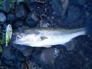 で、もう1歩進んだら、同じように顔色の悪いバスが岩の横に居た。バイブレーションをフリップで落としたら、着水直前にジャンプしてきたよ!ビックリ!乗らなかったけど、すげー勢いのあるヤツでした。