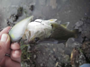 一旦クルマにもどってバイブレを用意。この辺では釣ったことがないってか、投げるのも初めてなので不安・期待で投げまくり。んで、ビッグバイト!こりゃデカイ!?ってか凄い重さ&パワー。コイ?いや、バスっぽい。遠くで掛かったので、巻きながら自ら寄りながら。で、半分くらい寄せたところでツーコンのバレ。ちょっと強引に巻きすぎたかな?うーん。逃がした魚は大きい。この後、ヨメもブリブリのナイスバスをジャンプ一発サヨウナラ。