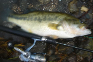 ワームを3インチに落としてみる。同じくトィッチしたらまた小さいのが2匹で沸いてきてバイト!でもワームが消えない。うーん、と思ってたら横から別のが出てきてワームが消えた。今度そこ!やっとヒットです。マメかと思ったらそーでもなくて足場が悪いのでけっこうー大変でした。