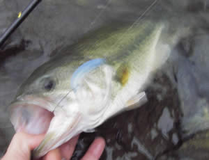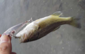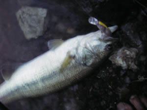 風波で水中が見えないんだけど、足下にバスがいるようで、ピックアップ直前にまたまたヌっと重くなって釣れた!これも、バーブレスだけど、足下だったので無事キャッチ。