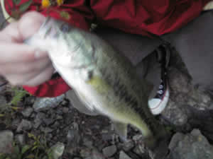 そんな訳で、オジさん、Nさん、ヨメ、オレの4人で勝負スタート。まずは昨日オレが3匹釣ったスポットから。オジさんは得意のスライダーバスグラブを投入。開始早々ヒットさせてて、すげー嬉しそう。バレロバレロと願うもキャッチしやがってた。で、そのヒットで周りのバスの活性UPか?3mほど横にキャストしたらオレにもヒット!良かった!小さい!足場が高いので、小さい方が確実に捕れて良いのだ。これでゼロは免れる。