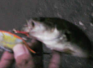 ヤラセで口にルアー付けてるけど、本当はあげた瞬間外れました。あー危なかった。この後も30cmくらいのを掛けたんですが、足下でばれました。フロントフックをリマックベンドのに変えてるんだけど、コレってばれやすい?気のせい?腕のせい?