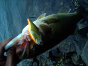 もう一歩進んで虫をトゥイッチ&フォールさせたらワームが消える。ロッドを倒して持って行かせてからフッキング。ノッタ。デジカメを忘れてるんで携帯でパシャリ。口に傷あり(過去にオレが釣ったやつか?)の30チョイ。