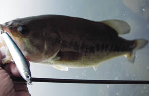 この時合(凄い小さいワカサギが接岸する)は5分ほどなので、急いで次のチャンスに備える。今度も、岸スレスレのカバー周りでボイル。直撃してヒット。
