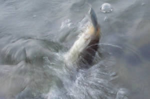 ボイルもおさまったので、カッコイイ方のバスを狙ってみる。沖の水面を凝視して怪しいヨレを探す。だいたい狙われている時は突然群れが固まって水面に沸いてくるのですぐに解ります。