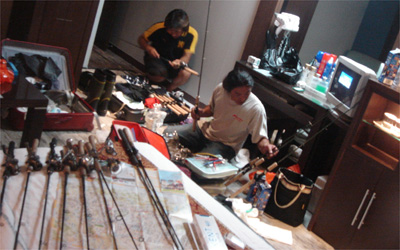 ワールドCUP韓国戦開始数時間前の激盛り上がりの中、ホテルでセッティング。この時は夢見がちなセット(笑)。んで、厳重に梱包してバズーガにロッドを入れてきたわけですが、ホテルでそれを取り出すときに壁に強打!一番高価なテムジン電撃がポッキリ(涙)。