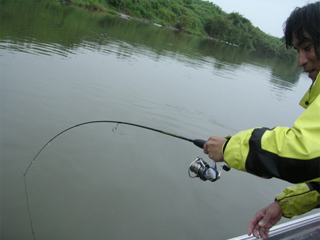 で、そのリグで浚渫の上流側の浅いとこを狙ったら、前触れもなくラインが上流へ走り出したわけで、あららら~ってかんじでヒット。もの凄い引き。