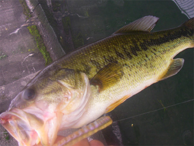 高いコンクリート護岸の壁にノーシンカーを当ててポチャリと落として引いてくると3~4匹で追ってくるのが見えた。引きしろが無くてUターンされるので、もっとボートを離して最近のマイブームなボディーワームのワッキーNS、水面ピクピクにチェンジ。そしたら、バッチリはまってプチフィーバー