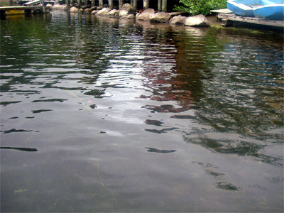 隣の本当のボート屋の桟橋を狙う。先端に1匹、途中は居なくて、岸から10mくらいまではいっぱい出てくる。口を開かせたのが2回あったけど、結局フッキング出来ず。残念(涙)