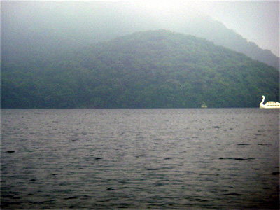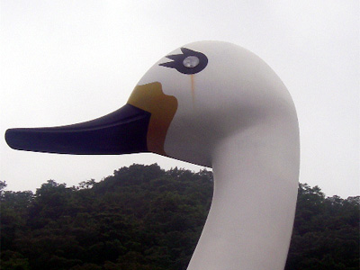 そうこうしてたら、白鳥号が寄港。山中湖のは目が光ります。ここのは、ちょっと小型バージョンなので光りません(未確認)。マツゲが前に向いてます。そしてやっぱり茶色の涙を流してます。
