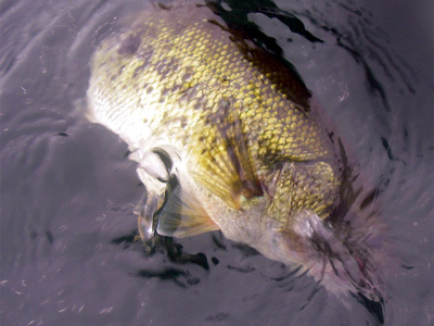 禁漁区を越えてすぐにシャローへ寄る。光量と波でイマイチ見づらい。大きい船の横にボディーワームをスキッピングで滑り込ませる。ヒクヒクヒクヒク・・・・寄ってきた~パクっと。