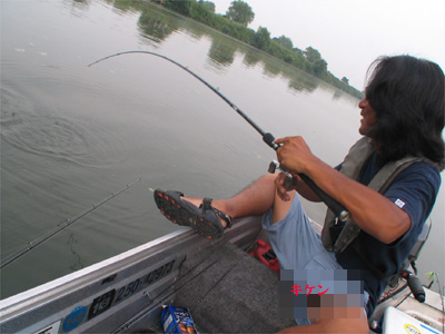 ラインがあんまり出てないので、もの凄いスピードのツッコミでロッドが刺さる。こ、こ、この引きは・・・・