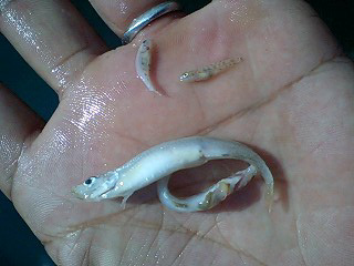 で、驚いたのは、子バスがファイト中吐きまくったゲロの中身。小~中のワカサギは見慣れてるけど、こんな小さいヨシノボリ系までいっぱい食べてた事。7mくらいにこの手の魚がいるんですね。しっかし、よくこんな小さいエサを見つけるな。改めて魚の凄さを知った。このハゼに比べたら、いつもテンチョにバカにされるオレの瓶ガルプの大きいこと大きいこと(笑)。ディープでハゼを食っているなら、イモの放置とかもナルホド釣れる訳なんだなーと思った。