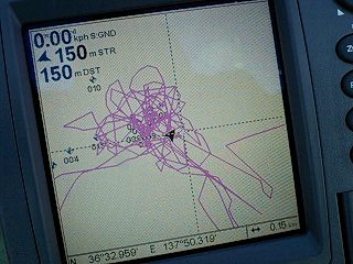さっき1匹釣れたときにGPSにWP(マーキング)打っておいたので、そこに戻ってみる。GPSのナビ機能を初めて使った。目的地の方向と残り距離とかが出るんだけど、残り100mで「あとちょっとで目的地だよ」的なダイアログ画面が出る。で、その画面が邪魔で地図が見えない(笑)。チラーハンドル握ってて、GPSは前にあるので、スイッチに届かず。一旦止まってダイアログを消す。で、走り再開。そしたら今度は残り50mで同じ画面(笑)。ウぜー。もちろん、設定で変えられるんだろうけど、なんせ初めて使うので。