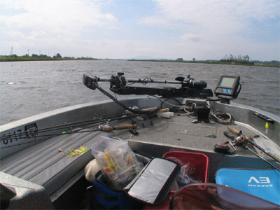 前日マーキングしてた数カ所の山を回ってみる。そしたら下流から長いスキーターがやってきた。ワールドワイドな活躍でお馴染みのFLWプロだ。で、お客さんがすぐに釣ってた!