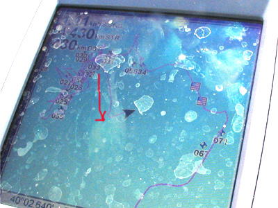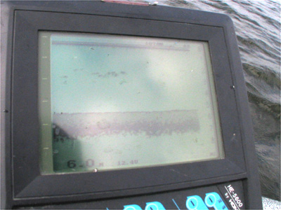 さっきの子バスで少し元気が復活。ちょっとやる気が出来た。冷静になってあたりを見回す。ワンド入り口部の200mくらいが風裏になってる。ワンド中央部は5~6m。岸に寄ってジグザグに走ると、2mまで一気にあがるブレイクが岸とほぼ並行にあった。この辺は一切やったことが無いけど、風裏部の4~5mラインにワカサギっぽい大きな固まりがいっぱい映って、上から2mくらいにも太いのが結構映った。