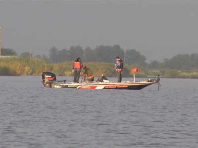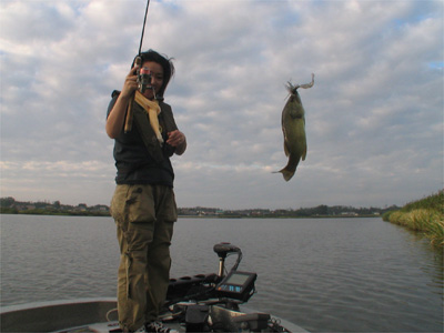 午後になり、ワールドワイドな活躍でお馴染みのFLWプロの大きいスキーターがやってきた。今日も東部は釣れない?