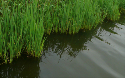 こんな感じのアシがベストです。水深は20~30cm、少しの凹みから出てくる感じ。