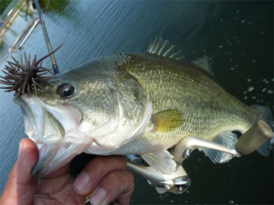 そんな訳で、オープンウォーターの釣りも面白いんですが、やっぱしバス釣りの醍醐味はゴチャゴチャややこしい所で釣る事。ってことでラスト30分はPEスピンで障害物周りダイレクト狙い。