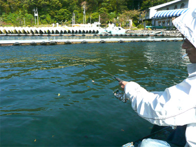 そんなわけで10時頃強風の桟橋でスタート。昨日見つけたチョイ沈みモノの周りに落とせば小さいヤツならいっぱい釣れた。昨日ちょっとだけやってノーフィッシュだったヨメを呼ぶ。今日なら簡単に釣れるぜ、って。