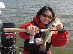 ここで並木さんが3/8ozを貸してくれた。いい人や。で、ボトムをゆっくりズル引きすると釣れるらしい。他のルアーとかスピナベの中層引きだとマメしか釣れないっていう。なるほどね。言われたとおりボトムをズル引きしてみたら一発でヒット!しかも40アップ!スゲーさすが世界の並木だ。ちょっと感動しちゃった&商売上手だなー。もうすぐ発売されるらしいんだけど、いっぱい買っちゃいそうだよー。まんまとハメられた俺だ。