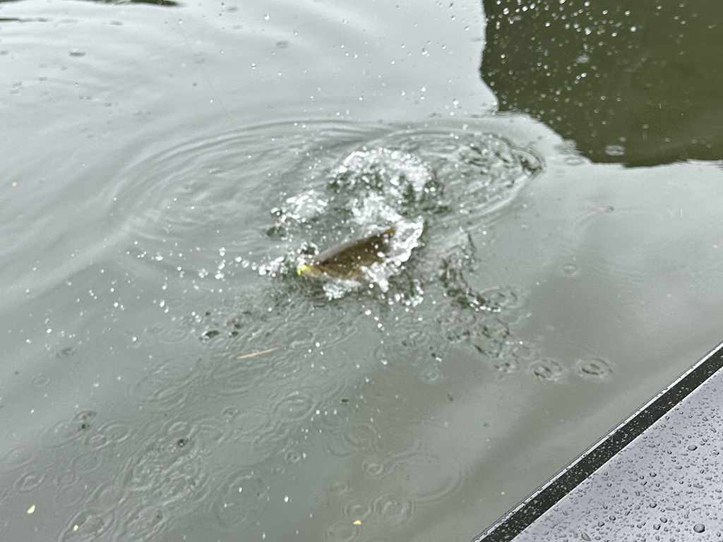 釣行前日、店長に「明日久々に釣りに行くんよ」ってゆったら「キャストできますかぁ?」なんて言われた。キャストくらいできるわ!って思ったけど、ちょっぴり不安だったので、ボートのランチング待ち時間にキャスト練習してみたら釣れた😆