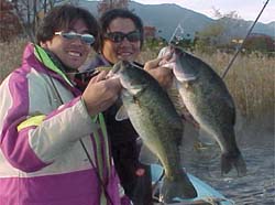 ミノーはマメしか釣れないと言い張っていたトノにまたまたナイスサイズがヒット!35くらいだけど、体高があって美しいバス。くっそーいいなぁ。そんでもって、トノにまたまたヒット!今度もデカイっぽい。ロッドが満月だ!うっそーん、いいなーいいなーと思っていたら、前でバズベイトを投げまくっていた大場さんのロッドも満月!ダブルヒットだよー。くやしー。トノのは43くらい、大場さんのは46センチ。この時期にバスベイトを投げるなんてさすがにアメリカンだなとは思ったけど、それで46センチを釣るとはさすがだ。夕方のフィーバースタートか!と思って必死に俺もキャストしたけど、、、、、