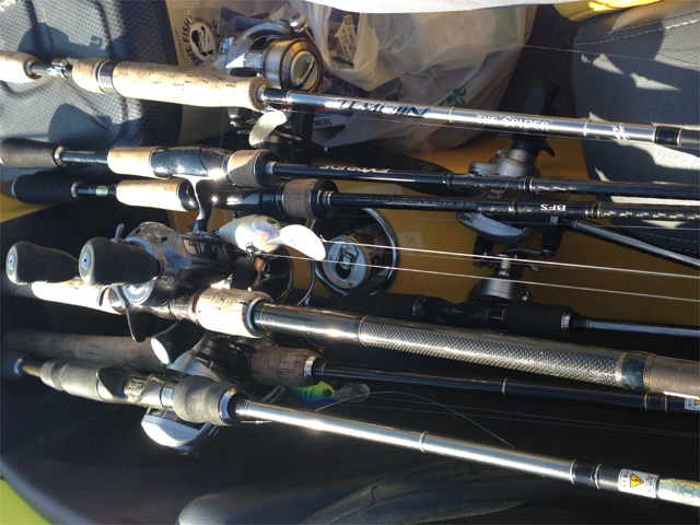 タックルはけっこうな数積んでます。けど、ボスの釣れ方からして、オレの持ち駒的には「スコーン」を試したかったんですよ。絶対とはいわないけど、高確率で釣れたと思うんですよねー。こんなにロッドは積んだけど、肝心のスタッガーを持ってきていないという大失態。途中どっかで秀雄さんと遭遇することをずっと期待してたけど、結局会えずでしたw