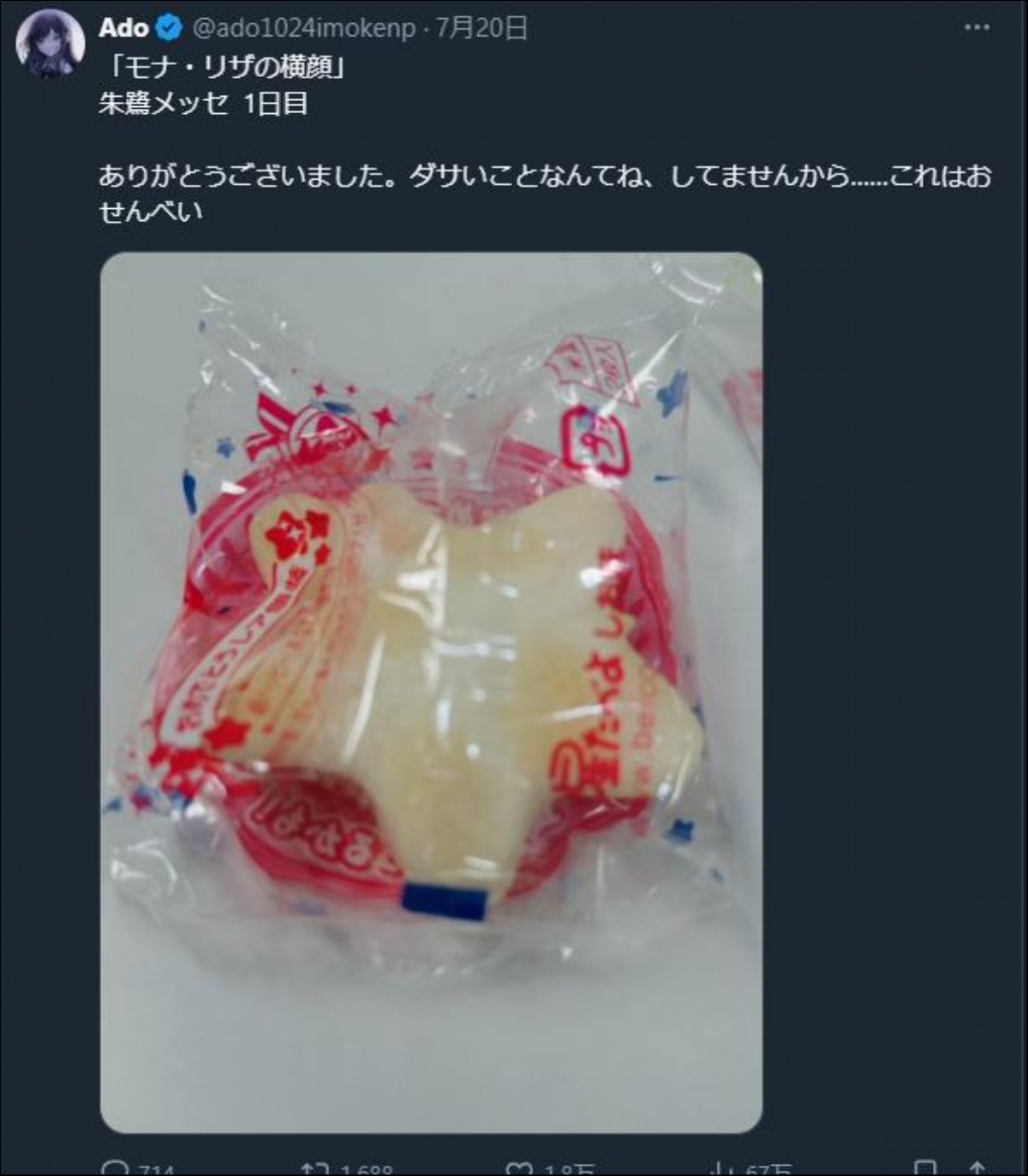 前夜AdoちゃんがXに上げてた星型のせんべいを発見!