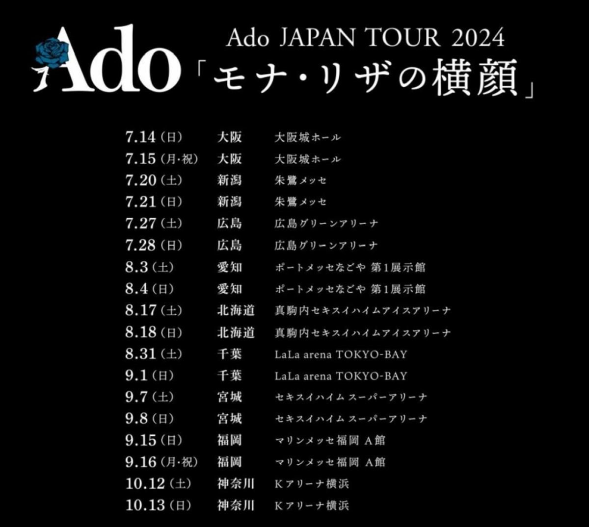 Adoちゃんの2024年夏~秋の日本ツアー「モナ・リザの横顔」。前も書いたけど6公演抽選応募したら5公演当たった😆 7月20~21日新潟公演に当選したのでレッツゴー新潟。