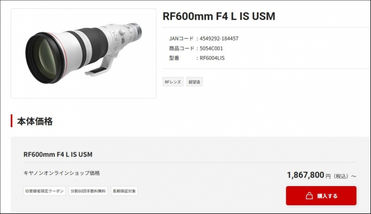 カメラでいうと、野鳥撮影レンズのゴールはこういうレンズなんですよ。キヤノン600mmF4単焦点で180万円