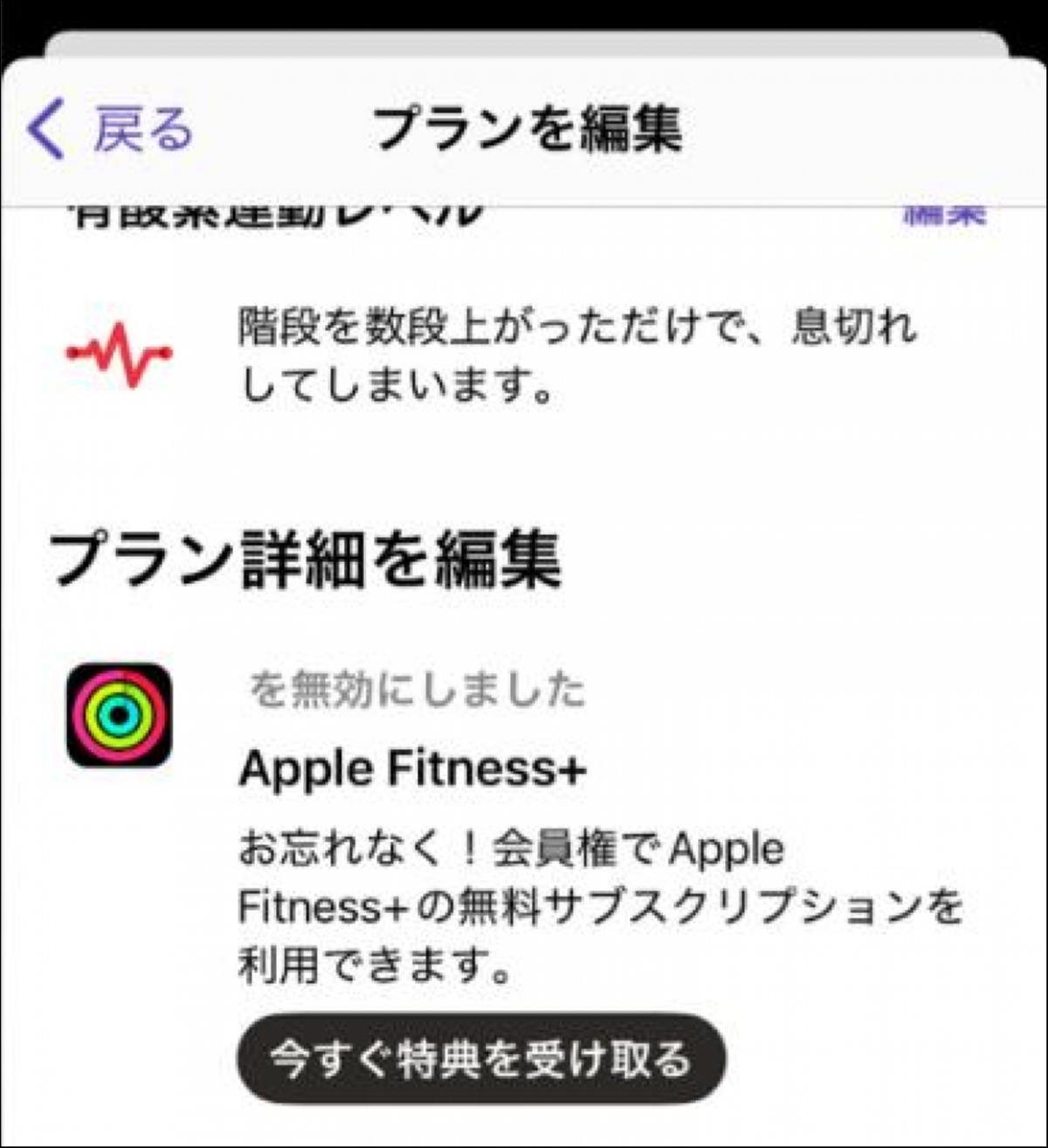 公式サイトには「バナークリック」とあるけど今日の時点ではバナーが無かったので、アプリの右上の人間アイコン->プランを編集にApple Fitness+のボタンがある。