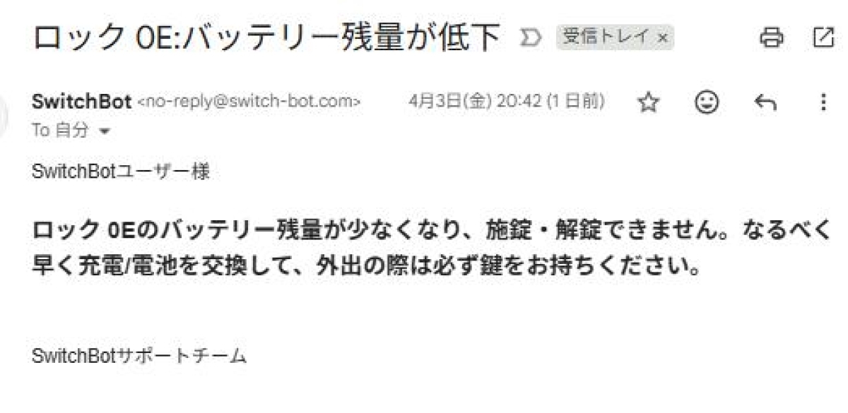 電池で動いているので電池なくなったらヤバイけど、そこはよく出来ている。電池減ってくるとまずSwitchBotから「ロック 0E:バッテリー残量が低下