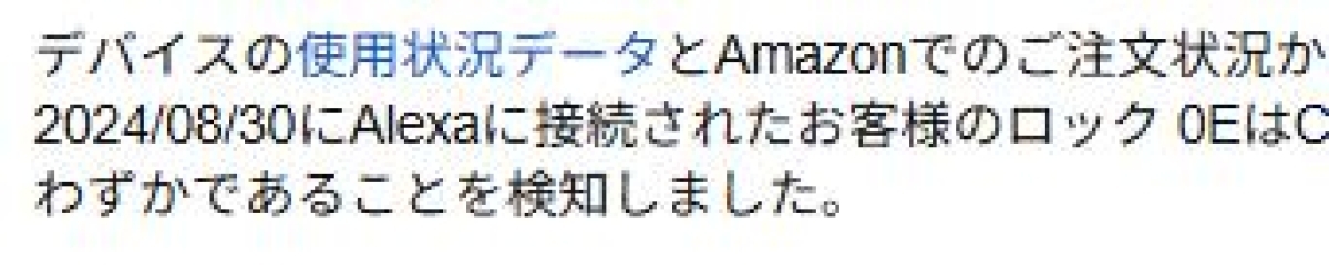 メール本文に「2024/08/30にAlexaに接続されたお客様のロック 0EはCR123A~」って俺アレクサと繋いだ覚えは一切ない。なんか勝手に機械同士で話し合って繋いでるのか?!